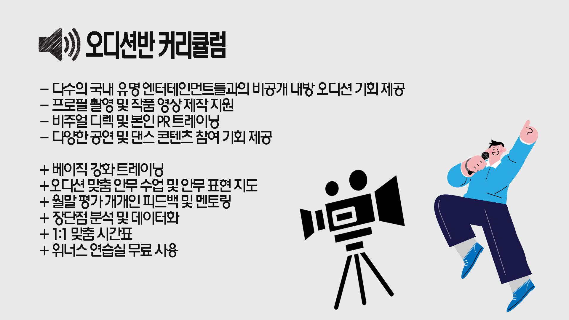 일주일 3-5클래스 수강 (주1-5회 선택) 토요일 K-POP / 코레오 클래스 필수 수강 그 외 수업은 상담을 통하여 진행됩니다. 토요일 오디션반에서는 장르 수업 외 다양한 커리큘럼 수업이 진행 될 예정입니다. (△위 상세 설명 확인) 9월 내방오디션 예정 MORE VISION ENT. 자세한 일정 추후 공지 |