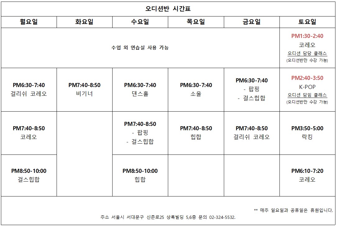 ▲오디션반 인원 모집 1차 23년 8월 1일 ~ 9월 1일 pm10:00▲ ▼9월 2일 오디션반 첫 시작▼ ![]() ▶오디션반 시간표◀