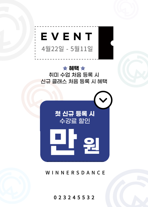 오늘부터 2주동안 위너스댄스학원에 처음 등록하시는 분들을 위한 이벤트를 시작합니다. 베이직반부터 레벨업 수업까지 1클래스라도 등록 시 혜택이 주어집니다. 기존에 다니던 수강생들이라도 수강하지 않았던 수업을 처음 등록할 경우 할인 혜택이 주어집니다. 난이도별로 수업 추천을 드리며, 처음 춤을 배우려는 분들에게도 딱 맞는 레벨의 반들을 추천드리니 부담가지지마시고 편하게 문의해주시면 안내드리도록 하겠습니다. 0 2 3 2 4 5 5 3 2 |